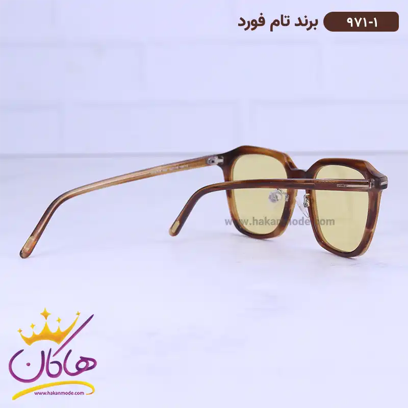 فریم این عینک که مهمترین قسمت آن است از نوع تمام فریم و به شکل مربع است. این فریم قهوه‌ای رنگ و طرح چوب است که به خوبی روی چشم قرار می گیرد. پهنای عینک شب تام فورد زرد زنانه 971/1 حدود 12.7 سانتی‌متر است. افرادی که صورت‌های مثلثی، گرد و بیضی دارند، از طرفداران این مدل عینک هستند. پل عینک، کائوچو و بینی گیر آن از جنس بدنه عینک است. رنگ عدسی زرد و عرض آن حدود 5.4 سانت است و چشم را کامل می‌پوشاند و در وسعت دید اشکالی به وجود نمی‌آورد. عرض پل 1.9 سانتی‌متر است و به خوبی روی بینی می‌نشیند. دسته عینک کاراملی و قسمت ابتدایی آن پهن تر از انتهای آن است. اگر به درون دسته توجه کنید سیم کشی فلزی درون آن را می‌بینید که به استحکام فریم کمک می‌کند. طول دسته حدود 14.5 سانتیمتر است و با یک قوس ملایم تا پشت گوش می‌رود. سبکی این عینک کمک می‌کند تا ساعت‌های طولانی یا هنگام رانندگیخصوصا در شب، عینک را به چشم بزنید و ابدا در قسمت گوش‌ها یا بینی احساس سنگینی و خستگی نکنید.