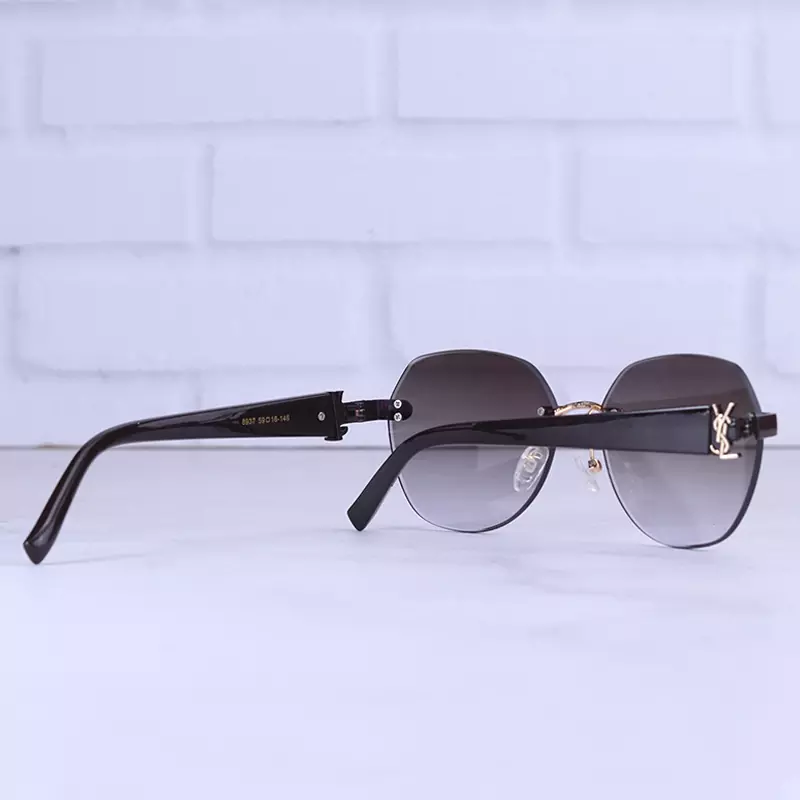 فریم این عینک که مهمترین قسمت آن است از نوع بدون فریم و به شکل چند ضلعی است. افرادی که صورتهای گرد، بیضی و قلبی دارند، از طرفداران پروپاقرص این مدل عینک هستند. عرض عینک آفتابی ایو سن لورن حدود 13.4 سانتیمتر است. پل عینک استیل طلایی و بینی گیر آن از جنس لاستیکی بسیار نرم و منعطف است. عرض پل 1.6 سانت است و به خوبی روی بینی مینشیند. رنگ عدسی دودی و عرض آن حدود 5.9 سانت است و چشم را کامل میپوشاند و در وسعت دید اشکالی به وجود نمیآورد. دسته عینک کائوچوی مشکی است و نام برند عینک سنت لورن روی دسته دیده میشود و طول دسته حدود 14.6 سانتیمتر است. این عینک تقریبا سبک است.