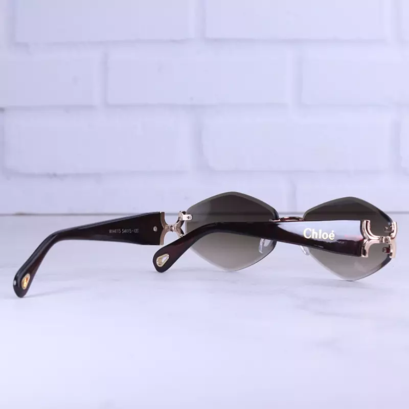 فریم این عینک که مهمترین قسمت آن است از نوع بدون فریم و به شکل چند ضلعی است. افرادی که صورتهای گرد، بیضی و قلبی دارند، از طرفداران پروپاقرص این مدل عینک هستند. عرض عینک آفتابی کلویی حدود 12.3 سانتیمتر است. پل عینک استیل طلایی و بینی گیر آن از جنس لاستیکی بسیار نرم و منعطف است. عرض پل 1.5 سانت است و به خوبی روی بینی مینشیند. رنگ عدسی مشکی روشن و عرض آن حدود 5.4 سانت است و چشم را کامل میپوشاند و در وسعت دید اشکالی به وجود نمیآورد. دسته عینک کائوچوی قهوهای است و نام برند عینک CHLOE به صورت درشت روی دسته دیده میشود و طول دسته حدود 13.9 سانتیمتر است. این عینک تقریبا سبک است.