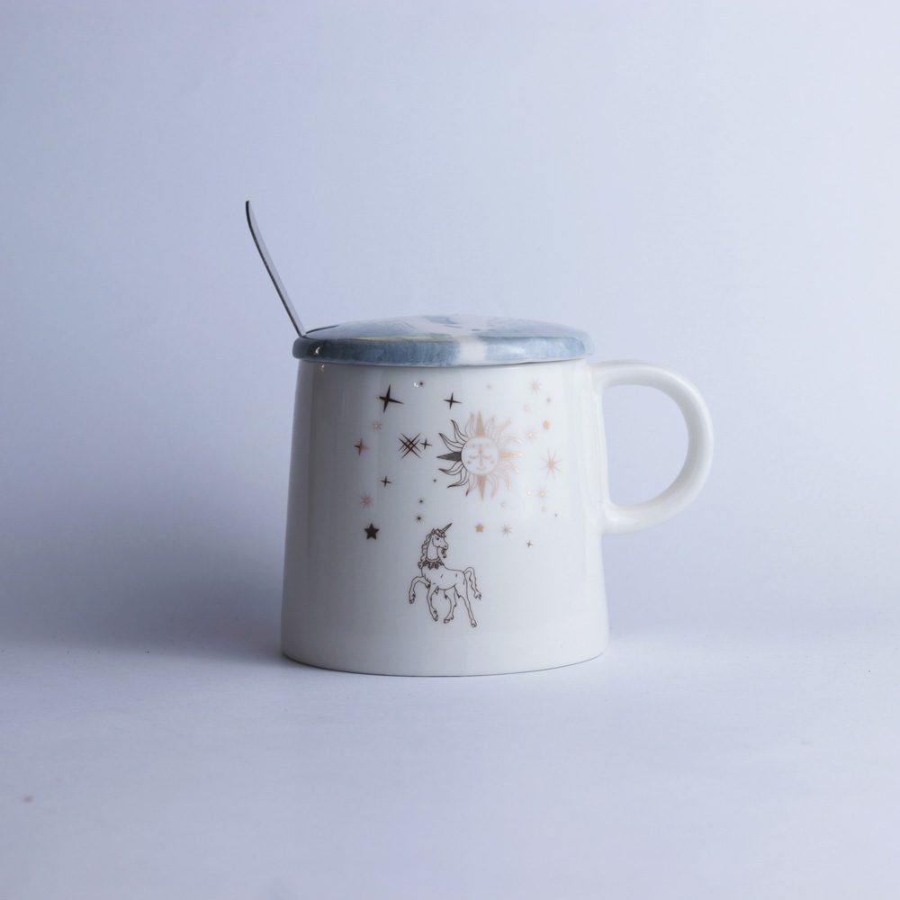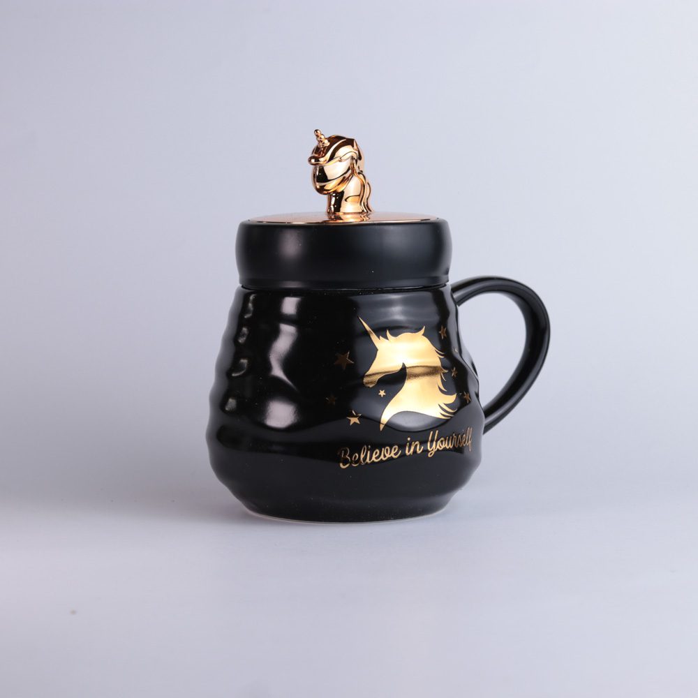 چشم ببند و به این ماگ دست بکش!این ماگ ترکیب این بدنۀ مواج با تصویر اسب تک شاخ، حس خوشایندِ در طبیعت بودن را به شما می دهد.همچنین ترکیب رنگ سفید و مشکی با طلایی این ماگ را بسیار شیک کرده. درِ آینه ای آن که با سر یک تک شاخ تزیین شده، پلاستیک فشرده و دوجداره است که شیر، چای و قهوه را برای زمان طولانی تری گرم و آبمیوه و اسموتی را سرد نگه می دارد.پیچی بودن این درپوش از ریختن مایع به بیرون جلوگیری می کند و به شما این امکان را می دهد که این ماگ را آسوده خاطر در منزل و خارج از آن استفاده کنید