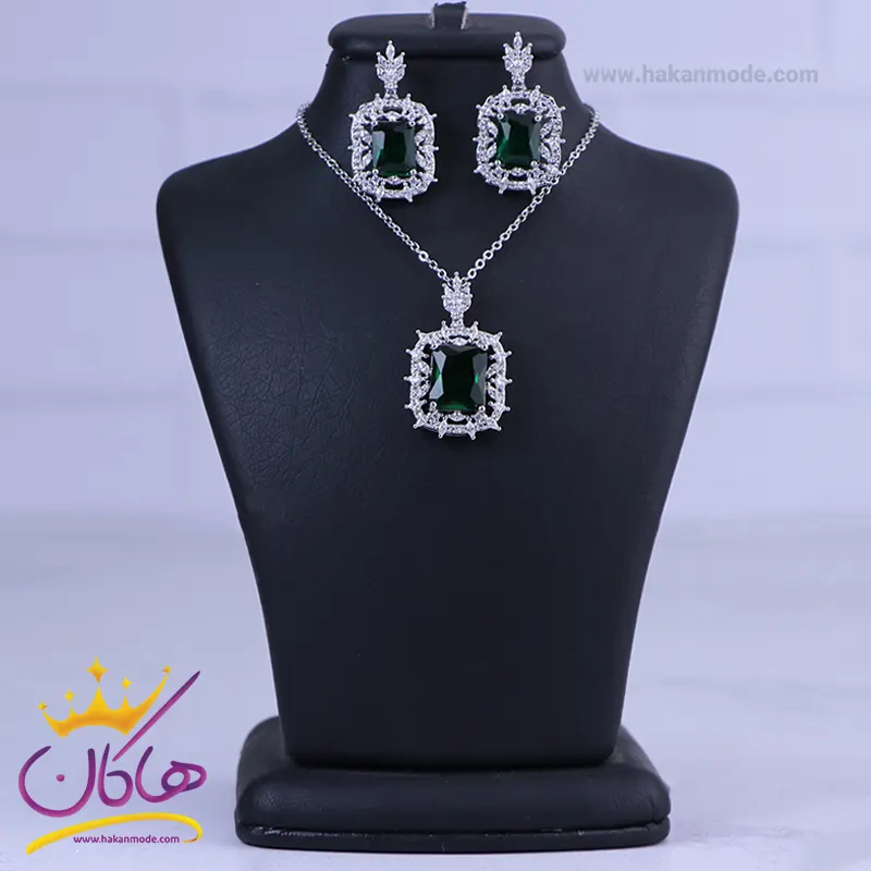 نیم ست استیل زنانه نگین مربع سبز از نمای نزدیک