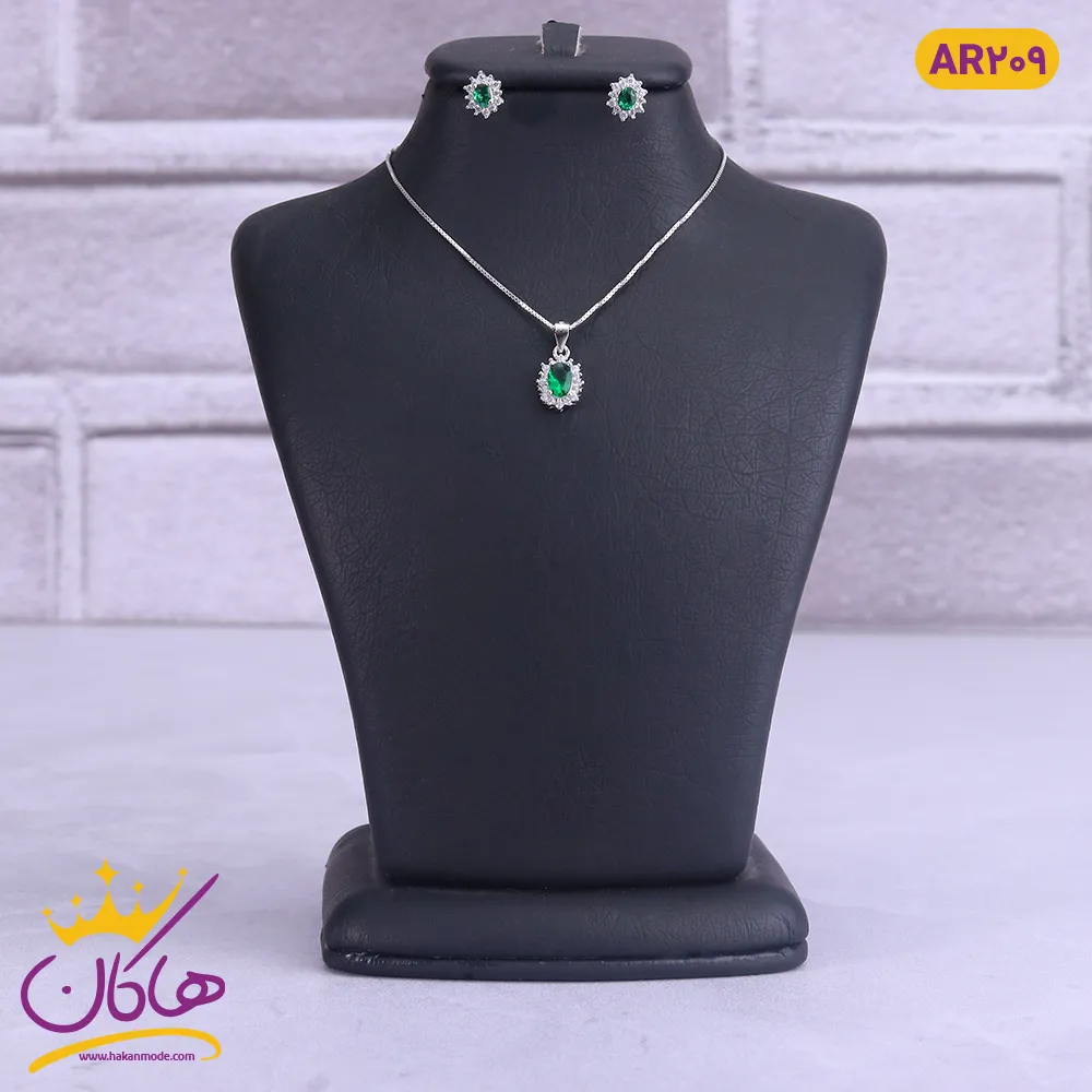 “name”: “نیم ست نقره خورشیدی بیضی نگین سبز | AR 209”,