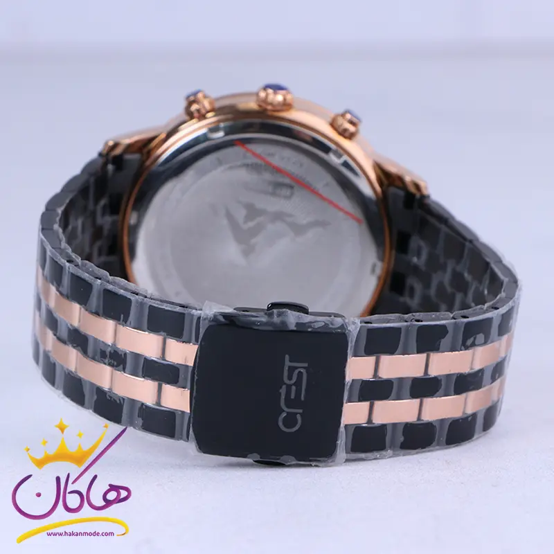 ساعت کرست مردانه ظاهری کلاسیک و جذاب دارد. قاب استیل این ساعت رزگلد، رنگ ثابت و ضدحساسیت است. اصلیترین چیزی که در ساعت مردانه کرست توجه ما را به خود جلب میکند، سه صفحه دایرهای کوچک است، که درون صفحه هستند. دایرههای موجود در صفحهی مشکی ساعت، هر کدام نشان دهندهی پارامتری خاص هستند. یک صفحه ساعت را به صورت ۲۴ ساعت نشان میدهد. گزینه بعدی روزهای هفته را نشان میدهد. دایرهی بعدی نشان دهندهی ساعت جهانی است. در سمت راست مربعی کوچک وجود دارد که نشانگر روزهای ماه بوده و همان تقویم ساعت نیز است. عقربهها، رزگلد شبنما و اندکسها خطی رزگلد هستند. اگر به درون صفحه نگاه کنید، نام برند برند crest زیر ساعت 12 دیده میشود. در کنار صفحه سه پیچ کوک برای تنظیم زمان وجود دارد. این ساعت دارای دو بند فلزی و چرمی است. بند فلزی ساعت، از نوع استیل مرغوب است که باعث تعرق و خارش نمیشود. طرح این بند از یک بافت ریز و درشت تشکیل شده و مشکی رزگلد است و قفل آن از مدل دوتکه دکمهدار است که از دسته قفلهای محکم و مطمئن است. ساعت بند چرمی از نوع چرم مرغوب است که پوسته پوسته و بریده نمیشود، همچنین باعث تعرق و خارش نمیشود. قفل این ساعت از مدل پروانهای دکمهدار است و ساعت به راحتی از دست نمیافتد. این مدل قفل، مثل قفل کمربندی روی بند ترک یا بریدگی ایجاد نمیکند و از محبوبترین قفلها است.
