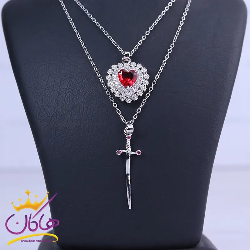 گردنبند استیل زنانه ست قلب و شمشیر قرمز، طرحی خاص و جذاب دارد. زنجیر این گردنبند مدل کابلی و همچنین رنگ این گردنبند نقره‌ای رنگ است. این گردنبند از دو زنجیر تشکیل شده، به زنجیر کوتاه‌تر یک قلب تمام نگین آویز شده است که در مرکز آن یک نگین باگتی قرمز رنگ دیده می‌شود. به زنجیر بلندتر یک شمشیر زیبا وصل شده است. طول زنجیر این گردنبند 44 سانتی‌متر است. قفل این گردنبند از نوع خرچنگی است. اگر به دنبال خرید بدلیجات رنگ ثابت و ضدحساسیت هستید، گردنبند استیل زنانه قلب و شمشیر، گزینه مناسبی است، چرا که از مرغوب‌ترین نوع استیل موجود در بازار است. خرید زیورآلات زنانه هم برای نوجوانان و هم خانم‌های میانسال بسیار جذاب است. این گردنبند از برند استنلس استیل است. قیمت گردنبند استیل زنانه استنلس استیل بر اساس کیفیت و اعتبار برند آن تعیین می‌شود. هاکان مد در تلاش است که بهترین کیفیت را با کمترین قیمت همراه کند تا رضایت همیشگی مشتریان خود را داشته باشد. برای خرید عمده گردنبند استیل با پشتیبانی هاکان تماس بگیرید تا از تخفیفات ویژه فروش عمده بهره‌مند شوید.