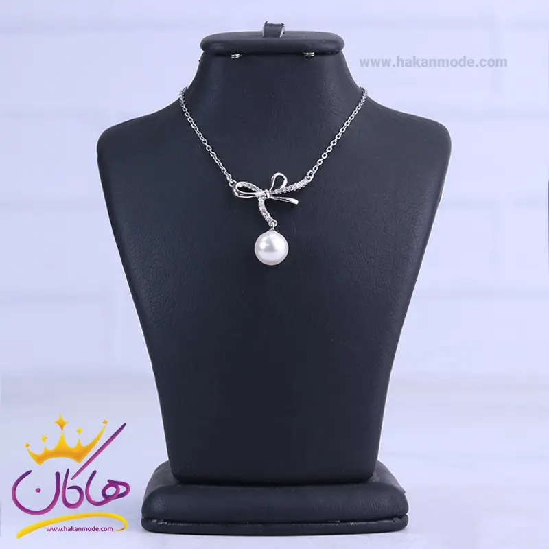 گردنبند استیل زنانه پاپیون و مروارید نقره ای از نمای نزدیک